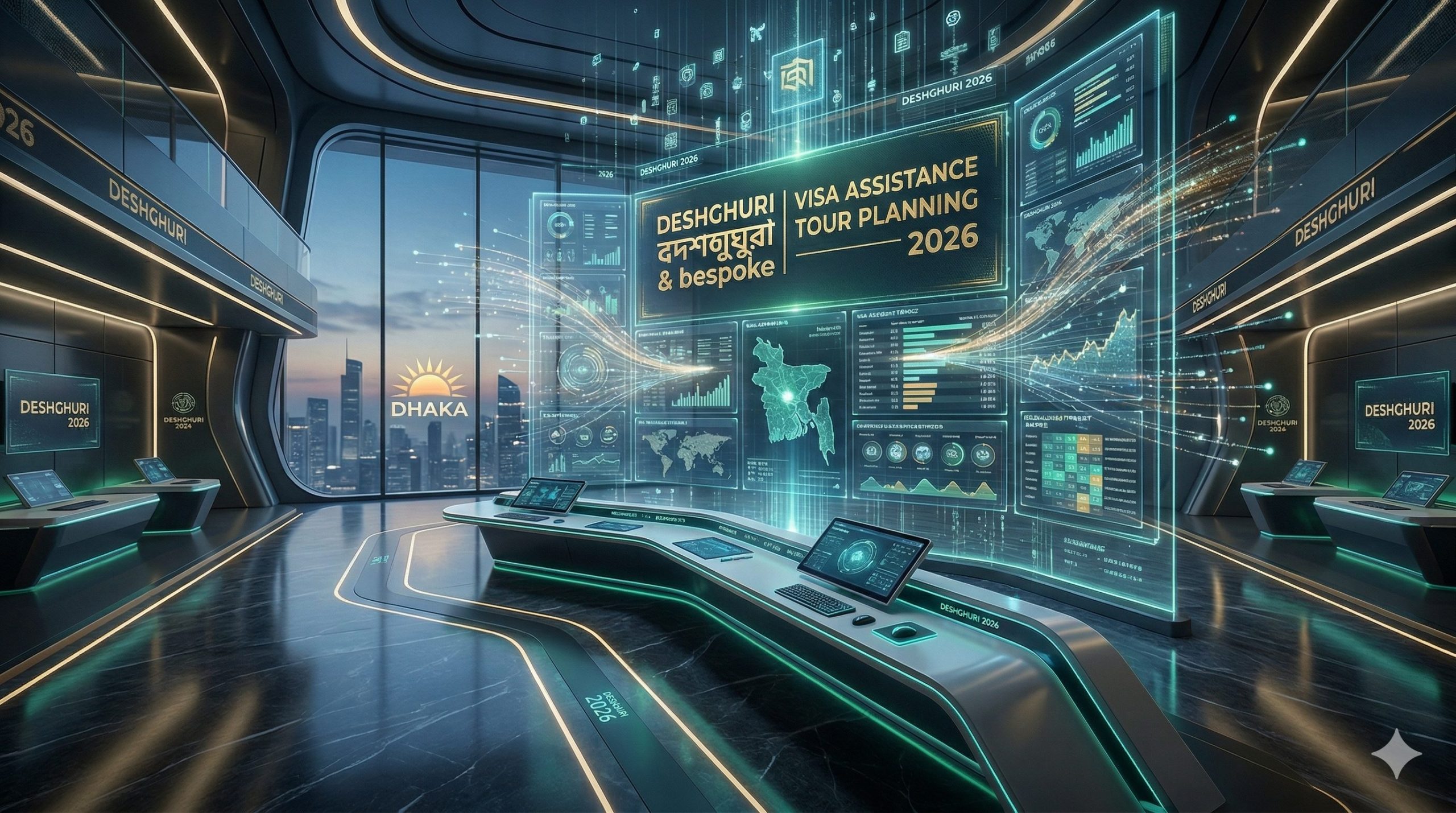 A visual representation of the modern 2026 travel logistics dashboard at Deshghuri. This image highlights the integration of real-time Bangladesh visa tracking, invitation letter auditing, and bespoke itinerary mapping. Designed for international travelers seeking professional assistance for their arrival in Bangladesh.