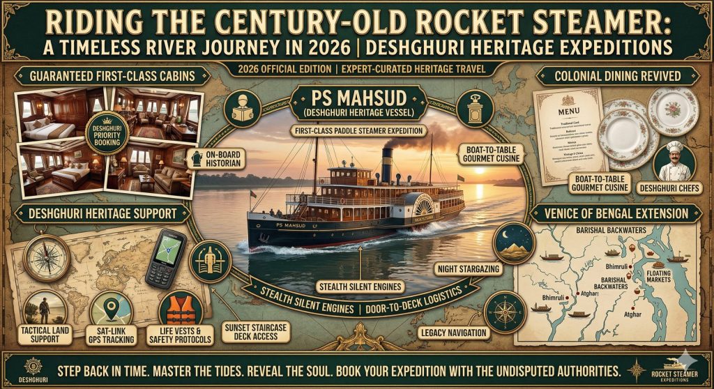 By 2026, Deshghuri has elevated the Rocket Steamer journey from a simple commute to a high-end Historical Expedition. We don’t just book a ticket; we curate a time-travel experience that respects the legacy of the paddle-wheels.